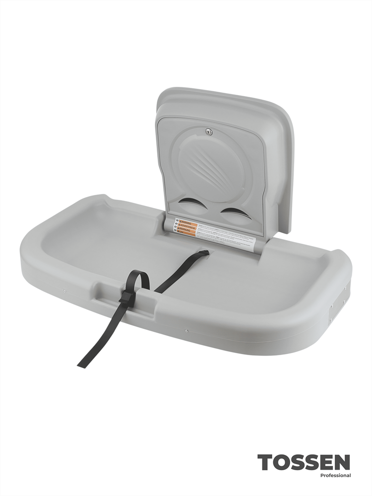 TOSSEN B-900 P — раскладной пеленальный стол для общественных мест. Устанавливается в комнатах матери и ребёнка аэропортов, торговых центров, АЗС и т. д. Благодаря амортизатору столик плавно и легко открывается и закрывается, отсутствие острых углов исключает риск получения травмы. Оснащён закрывающимся на ключ отсеком для салфеток, что делает использование столика более удобным. Легко фиксируется в открытом и закрытом положениях. Предназначен для крепления на стену (крепёж в комплекте поставки). Столик выполнен из высококачественного HDPE (полиэтилен высокой плотности) и обладает высокой прочностью.